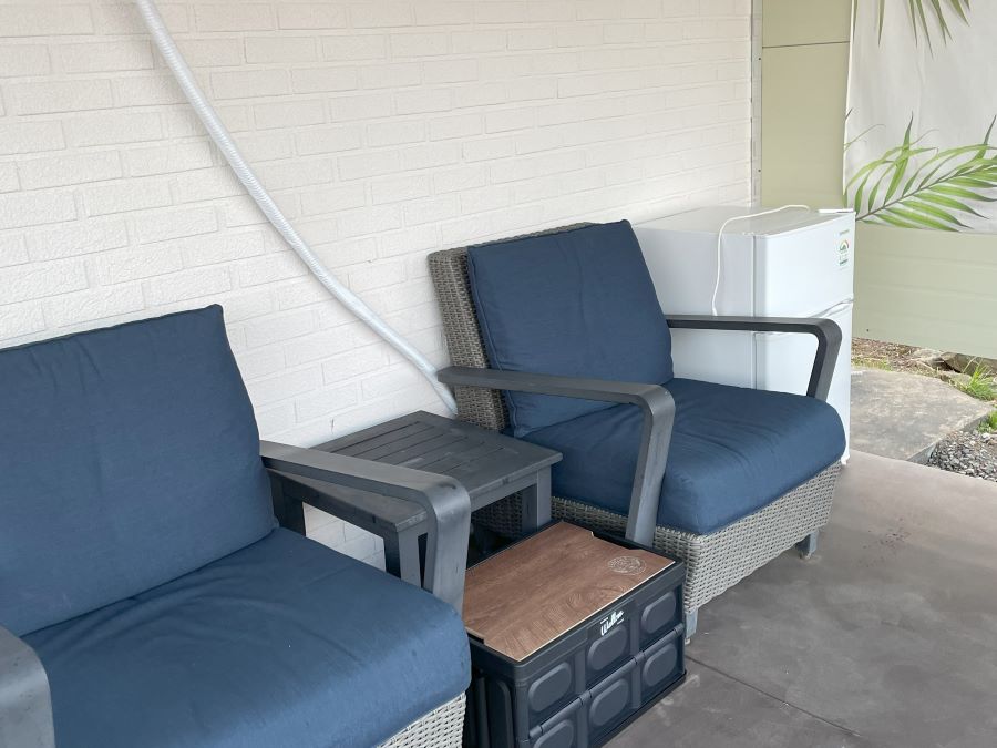 B-5룸은 특히 단독으로 사용할 수 있는 마당이 있는데 발코니 샤시로 나갈 수 있다. 편안한 소파나 해먹에서 누워 캠핑 분위기를 즐길 수도 있다. 룸이 큰 편은 아니지만 침대와 바닥에서 자면 4인은 충분히 수용 가능하다.