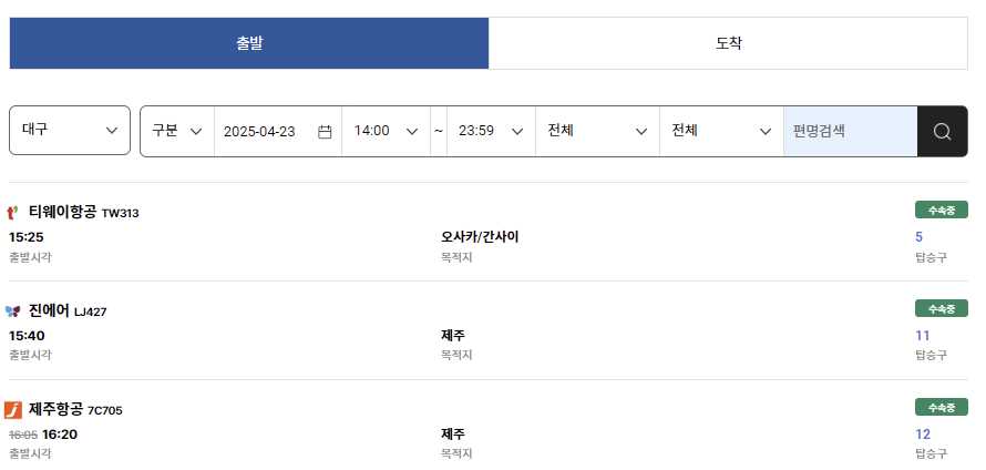 대구국제 공항에서 출발 도착하는 실시간 항공편 운항 정보는 아래 사이트에서 확인이 가능합니다. 날짜와 목적지, 항공사, 편명을 입력하면 쉽게 찾을 수 있으니 활용해 보시길 바랍니다.