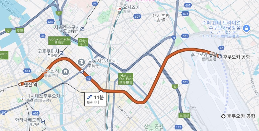 후쿠오카 공항에서 텐진역까지는 약 11분 소요됩니다. 요금은 260엔이구요.
