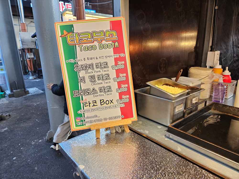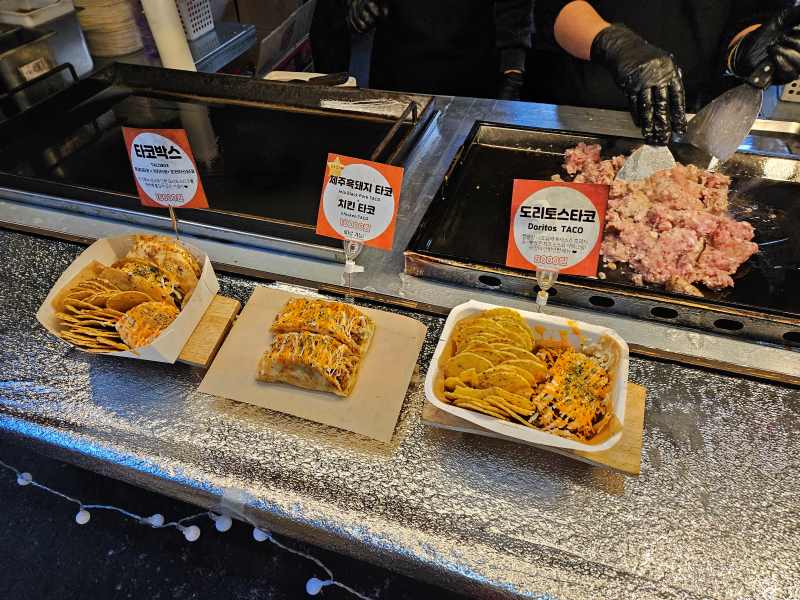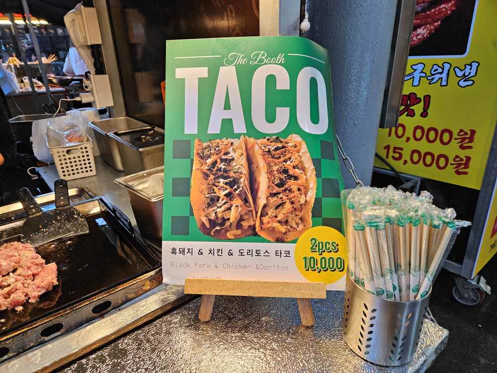 올레시장 야시장 타코부스는 흑돼지 타코, 치킨 타코는 2개에 만원이고 도리토스는 2개에 8천 원이다.