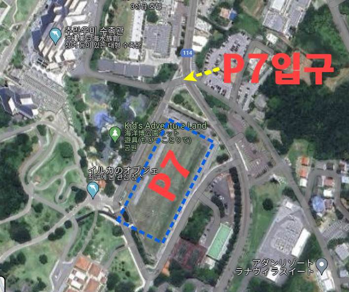 키즈 어드벤쳐 렌드 앞이 추라우미 수족관과 가까운 P7 주차장인데 위 구글 지도에 있는 입구 진입후 쭈~~욱 들어가서 주차를 하면 된다.