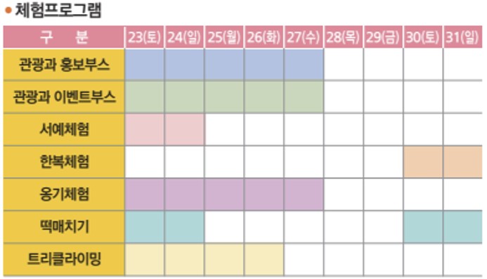 4월 23일 부터 31일까지 다양한 체험 프로그램이 진행된다. 서예 체험, 한복 체험, 옹기 체험, 떡매치기, 트리클라이밍