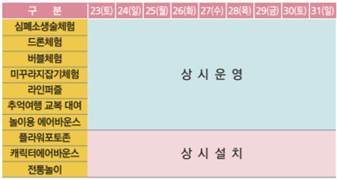 그리고 아이들이 호기심을 가지고 참여할 수 있고 교육적으로 의미도 있는 프로그램도 있는데 심폐 소생술이나 드론체험 전통놀이뿐만 아니라 버블체험, 미꾸라지 잡기 체험, 교복 대여, 캐릭터 에어바운스까지 놀거리가 풍부하다.