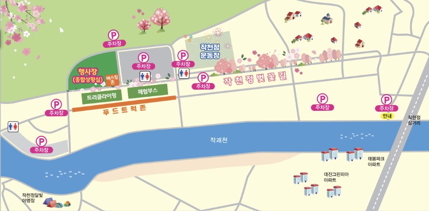주차장은 곳곳에 마련되어 있어 많은 인파가 몰리더라도 수용할 수 있도록 계획되어 있다. 작쾌천 물줄기를 따라 조성된 벚꽃길 양 옆으로 주차장이 있으며 작천정 운동장 건너편에도 체험부스와 가까운 곳에 주차장이 있다.