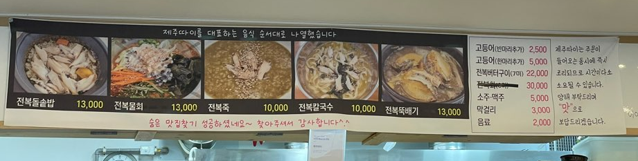- 전복 뚝배기 13,000원 이 메인 메뉴이며