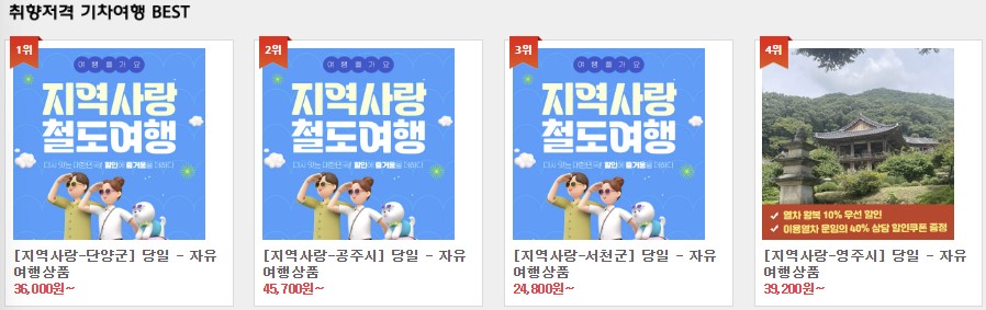 지역사랑 할인 여행 상품으로 공주, 삼척, 단양, 서천까지 당일 자유여행 상품이 2만원대부터 다양하게 판매되고 있구요. 1박포함인 강원여행은 24만원대에 기차+숙소 여행으로 진행되고 있으니 참고하세요.