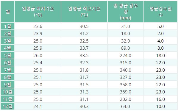 베트남 푸꾸옥은 열대 지방으로 1년 내내 따뜻하고 다소 습한 날씨가 지속된다. 평균 기온은 25도에서 30도 정도이며 습도는 50%를 넘는 날이 대부분이다. 월별 베트남날씨 알아보자.