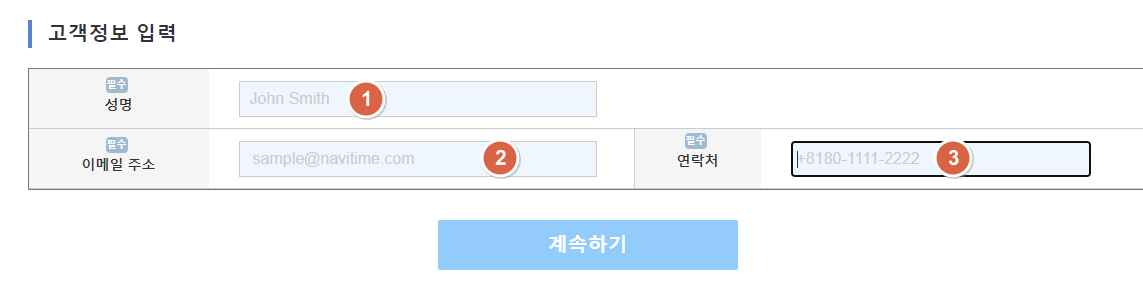 3. 다음 페이지에서 고객 정보를 입력합니다. 연락처는 한국 +8210-0000-0000으로 입력하세요. QR코드를 받아야하니 정확하게 입력하세요.
